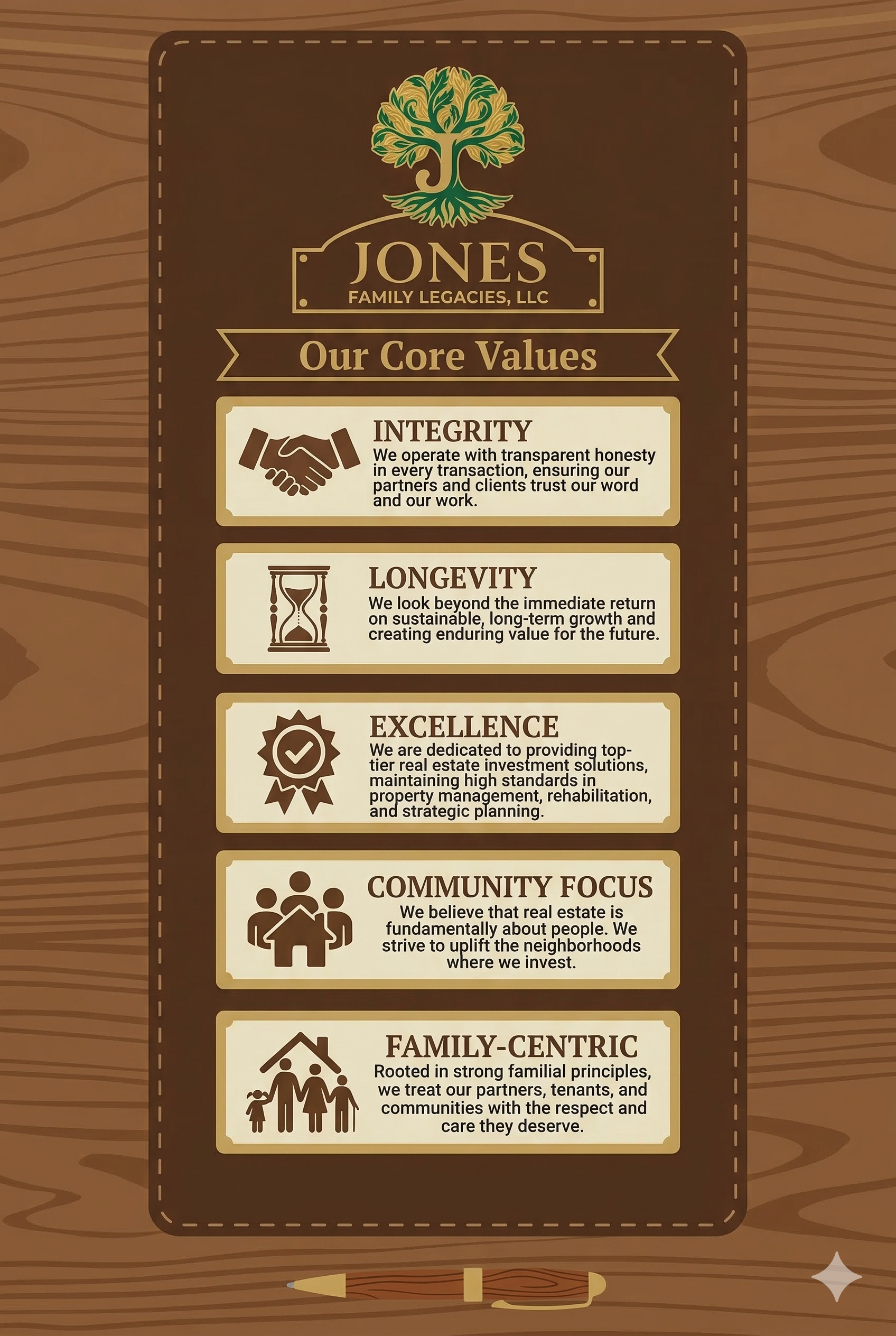 To provide strategic real estate investment solutions that empower families, revitalize communities, and create wealth that endures for generations.