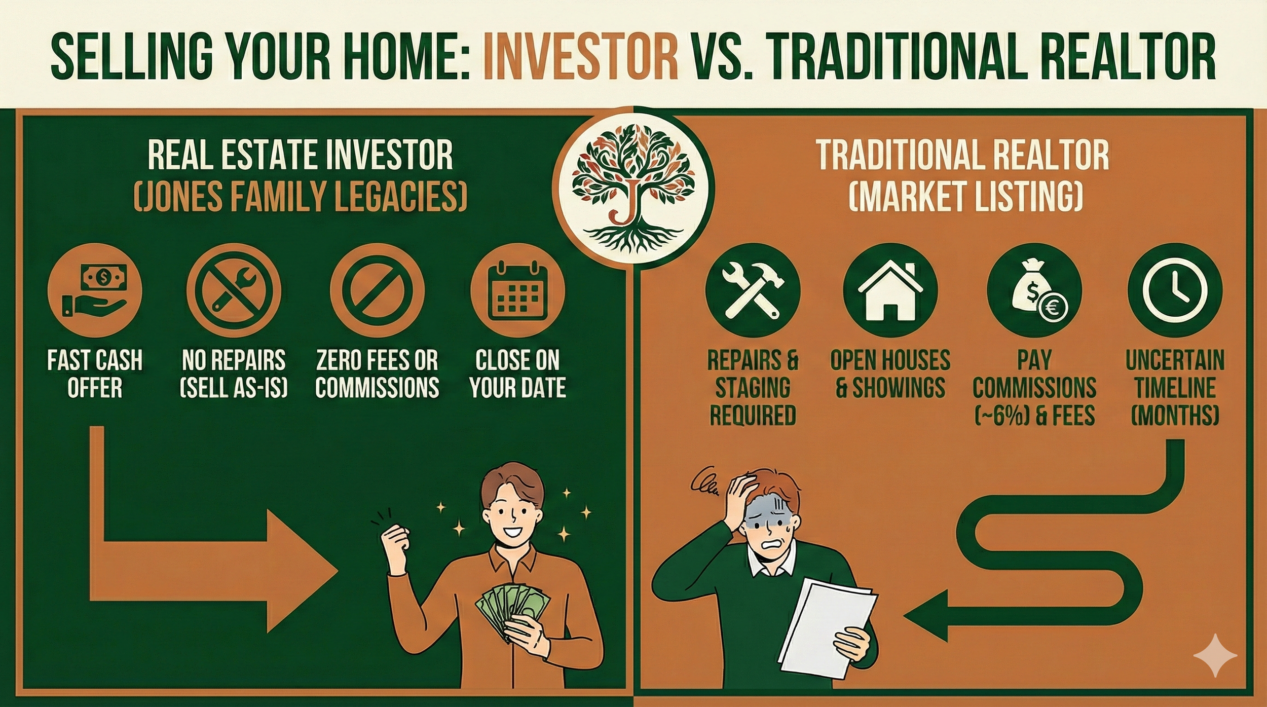 At Jones Family Legacies, LLC, we provide a streamlined, stress-free alternative to the traditional real estate market. We buy your house exactly as-is, meaning you never have to worry about cleaning, repairs, or staging. With no realtor commissions or hidden fees, we provide fair cash offers and can close in 30 days or less—putting you in complete control of your timeline.